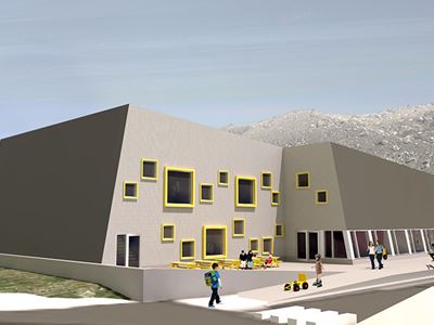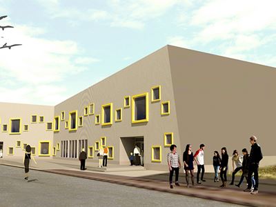 Bygningens facader udstråler også leg, med de forskellige størrelser af vinduer, der hver er markeret med en kraftig gul ramme og placeret så de danser op og ned af facaden.
