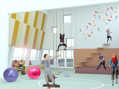 Bevægelse er et bærende tema og element i den arkitektoniske udformning, både indvendigt og udvendigt. Institutionen udføres som en idrætsinstitution i to etager og rummene i bygningen designes både til forskellige typer idrætsaktiviteter som boldspil, dans og gymnastik osv. men også til de mere stille og rolige og finmotoriske aktiviteter.