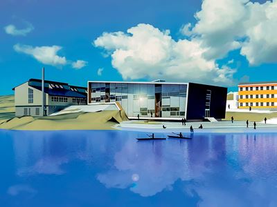 Den eksisterende bygning 2 er udvidet med 150m² så der opstår et stort forsamlingsrum i åben forbindelse med biblioteksfunktion og øvrige opholdsarealer.